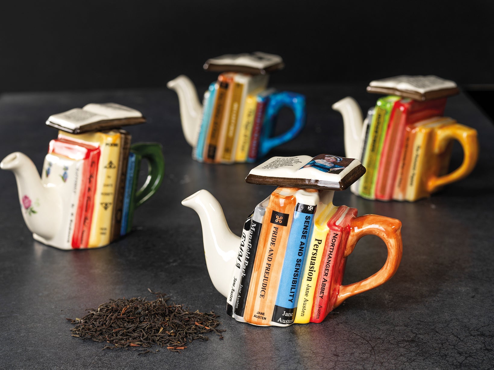 Celebrate the literary legacy of Jane Austen with this handmade one-cup teapot, designed to resemble a colorful stack of her most beloved novels. Topped with an open book and featuring titles like Pride and Prejudice, Sense and Sensibility, and Persuasion, this teapot is a thoughtful gift for any book lover. Crafted in Suffolk, England, it’s fully functional and hand-painted with rich detail.