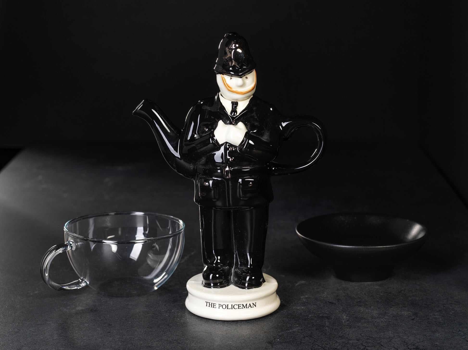 This Policeman teapot from Carters of Suffolk is a charming tribute to British law enforcement. Handmade and hand-painted in England, it features a smiling officer in traditional black uniform, complete with helmet, standing at attention. The spout extends from one arm and the handle from the other, seamlessly blending form and function into a delightful ceramic keepsake.