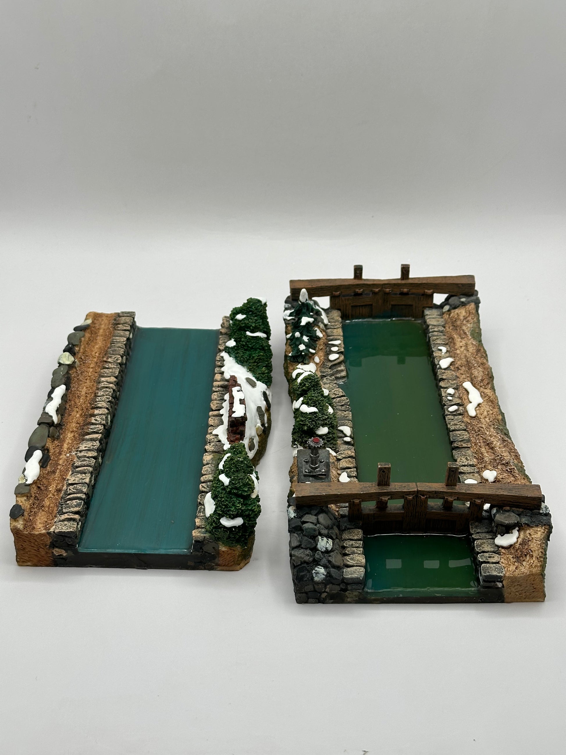 Abington Locks features a classic canal lock system with stone walls, wooden gates, and flowing “water,” capturing the look and feel of 19th-century engineering. Lush greenery and brick accents complete the scene, making it a perfect piece for creating depth and storytelling in your village display. Ideal for placing alongside mills, warehouses, or any riverside setting.