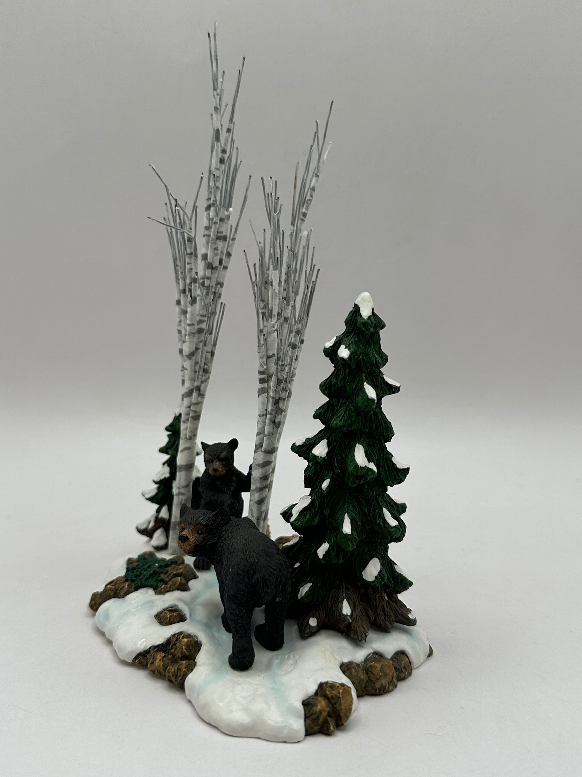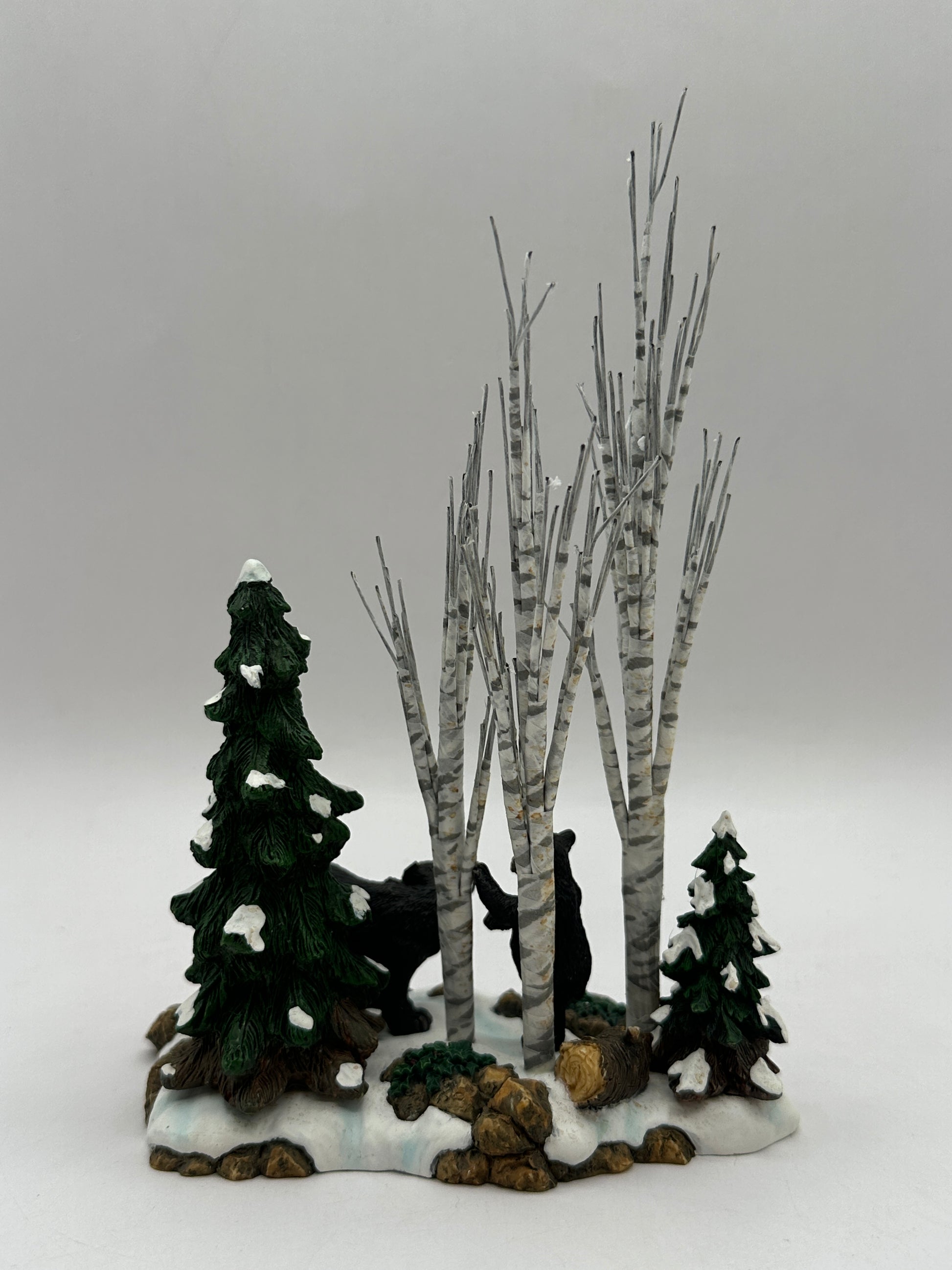 A pair of curious black bears wander between delicate birch trees, creating a peaceful woodland moment in your display. This charming accessory adds a touch of nature to snowy scenes, forest edges, or cabins within your village.
