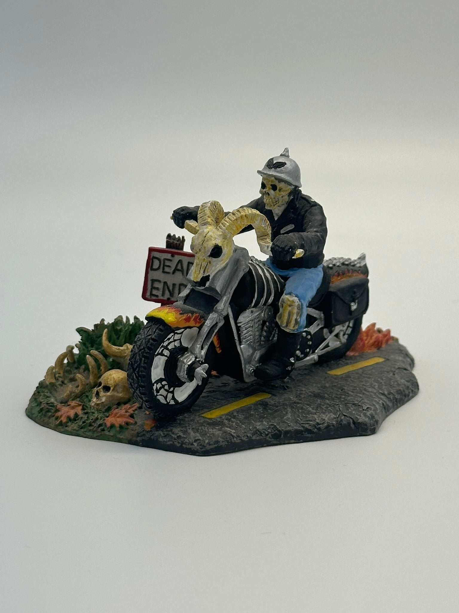 Rev up your Halloween display with Bone To Be Wild, a striking accessory featuring a skeleton biker cruising down a haunted highway. With a ram skull on the front of his motorcycle, a trail of bones and skulls behind him, and a “Dead End” sign warning of what’s to come, this piece delivers bold attitude and eerie detail. Clad in a leather jacket and helmet, this rider from the underworld adds edge and energy to any Halloween village. A perfect pick for collectors who like their scenes with a little rebellion.