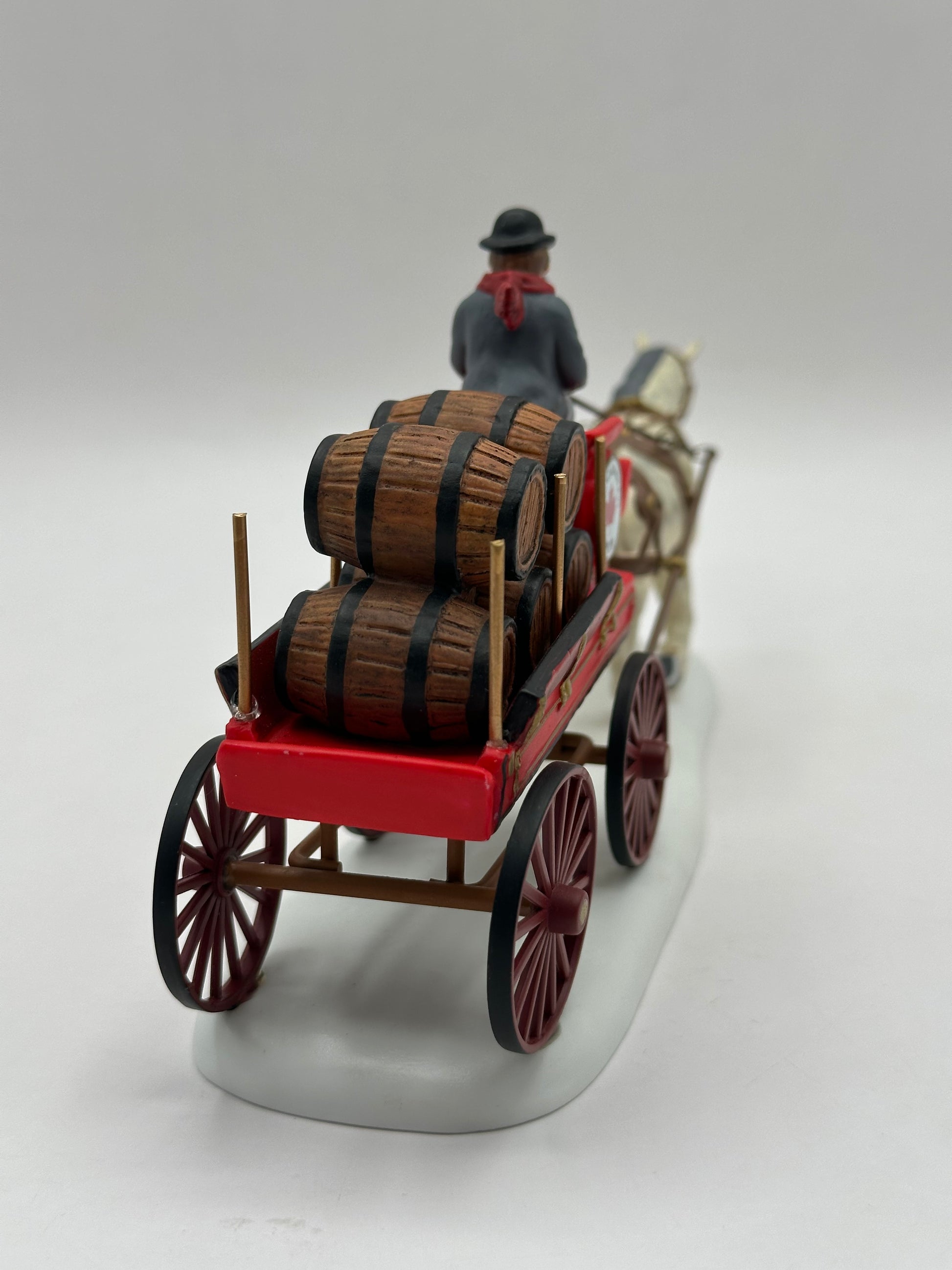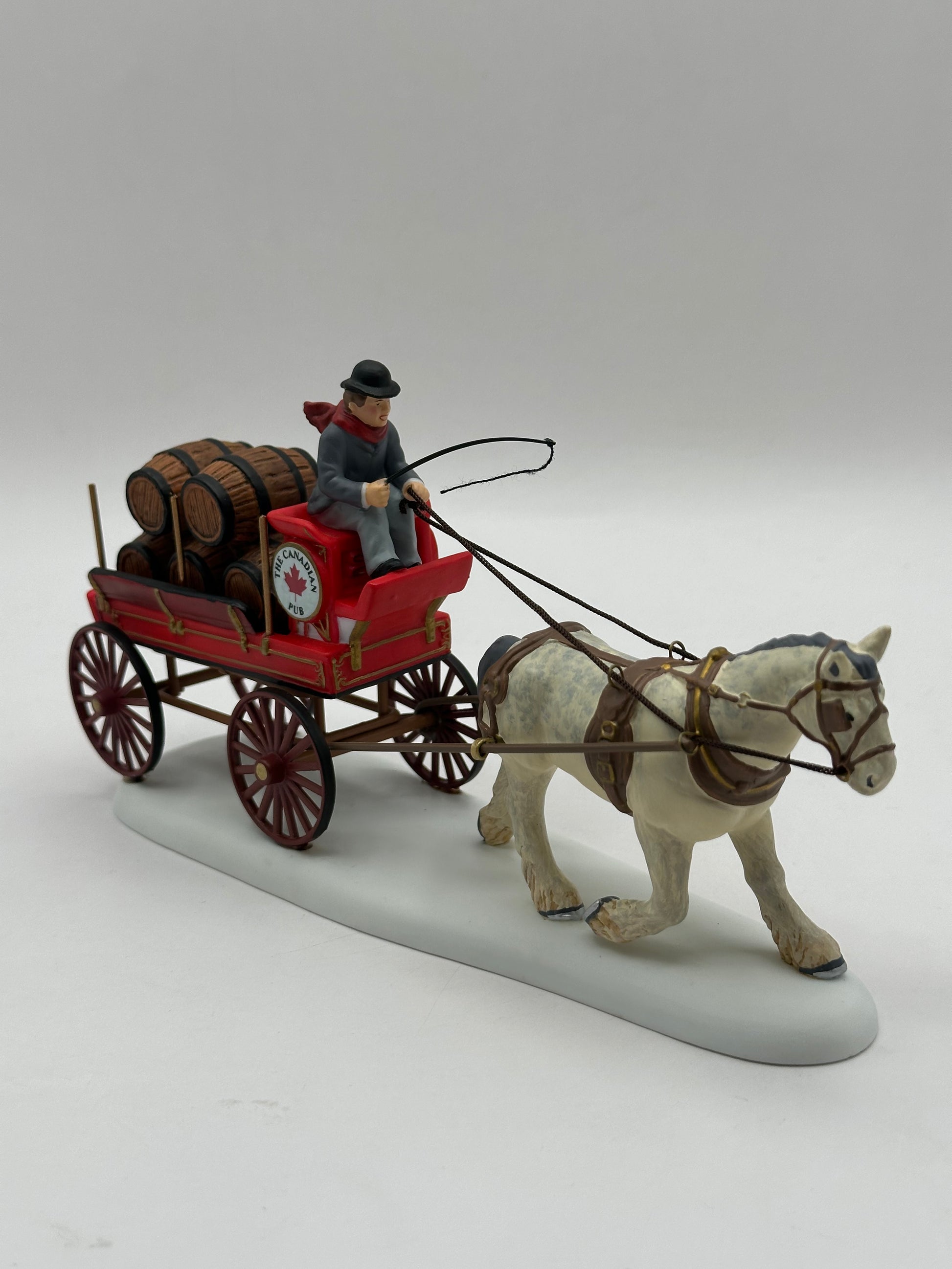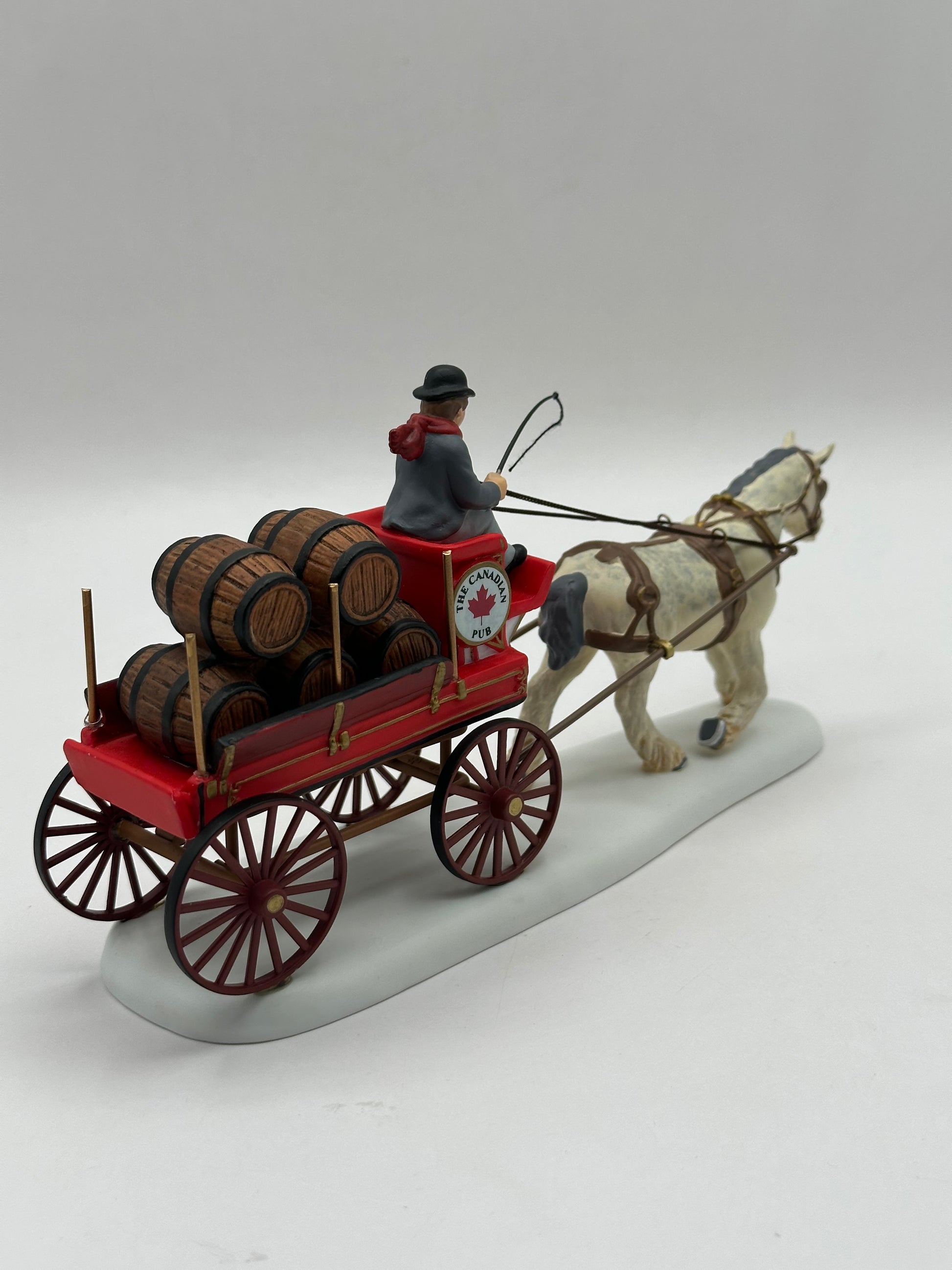 Canadian Pub Beer Wagon adds a touch of lively festivity to your village display. This detailed piece shows a traditional wagon loaded with kegs, ready to deliver fresh beer from the local pub. The driver’s cheerful pose and period attire capture the spirit of community and celebration,