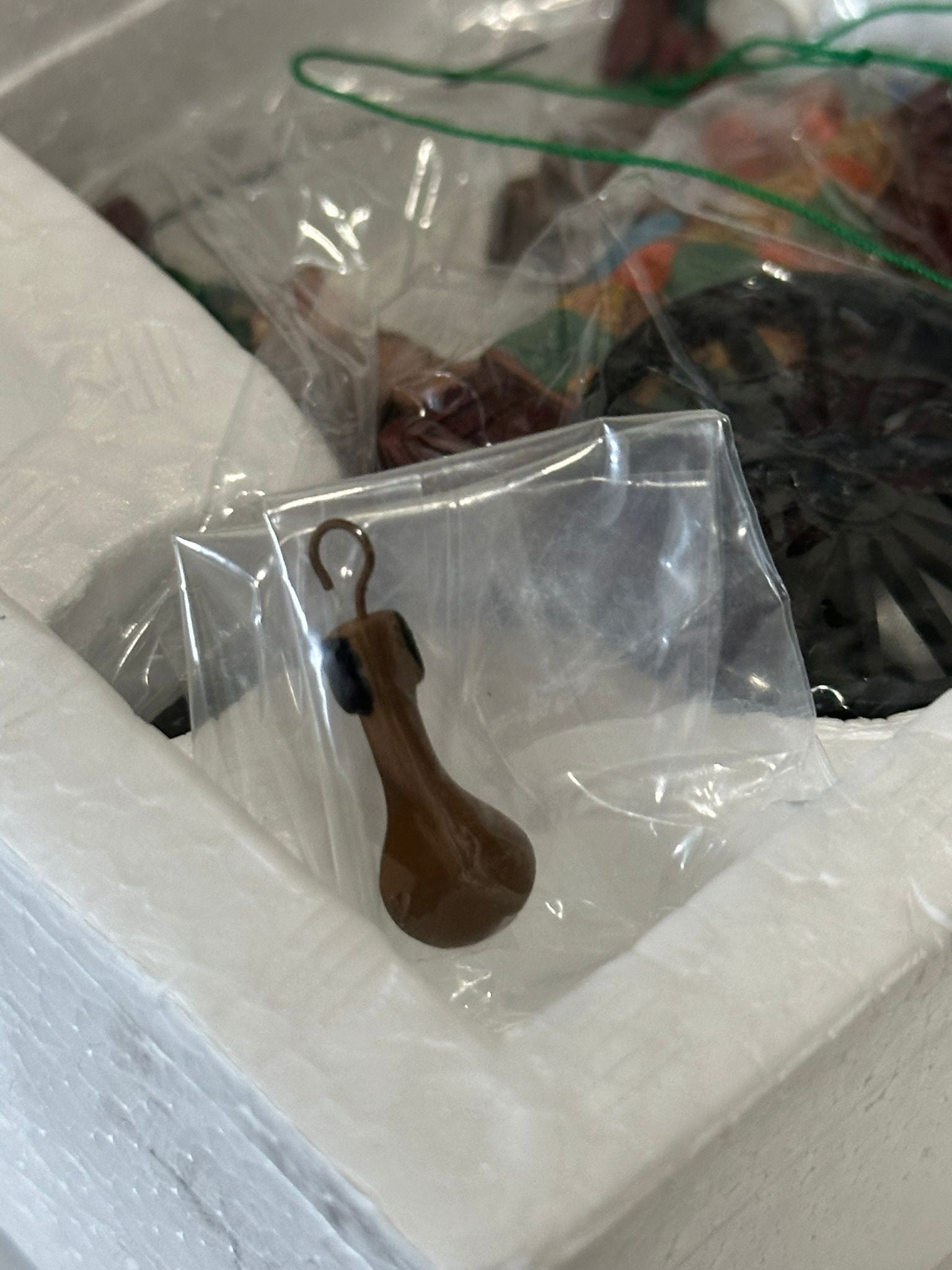 The Chelsea Market Curiosities Monger & Cart captures the lively spirit of a Victorian street market. The monger offers an assortment of unusual and intriguing items from his wooden cart, drawing curious townsfolk eager to see what treasures they might find.
