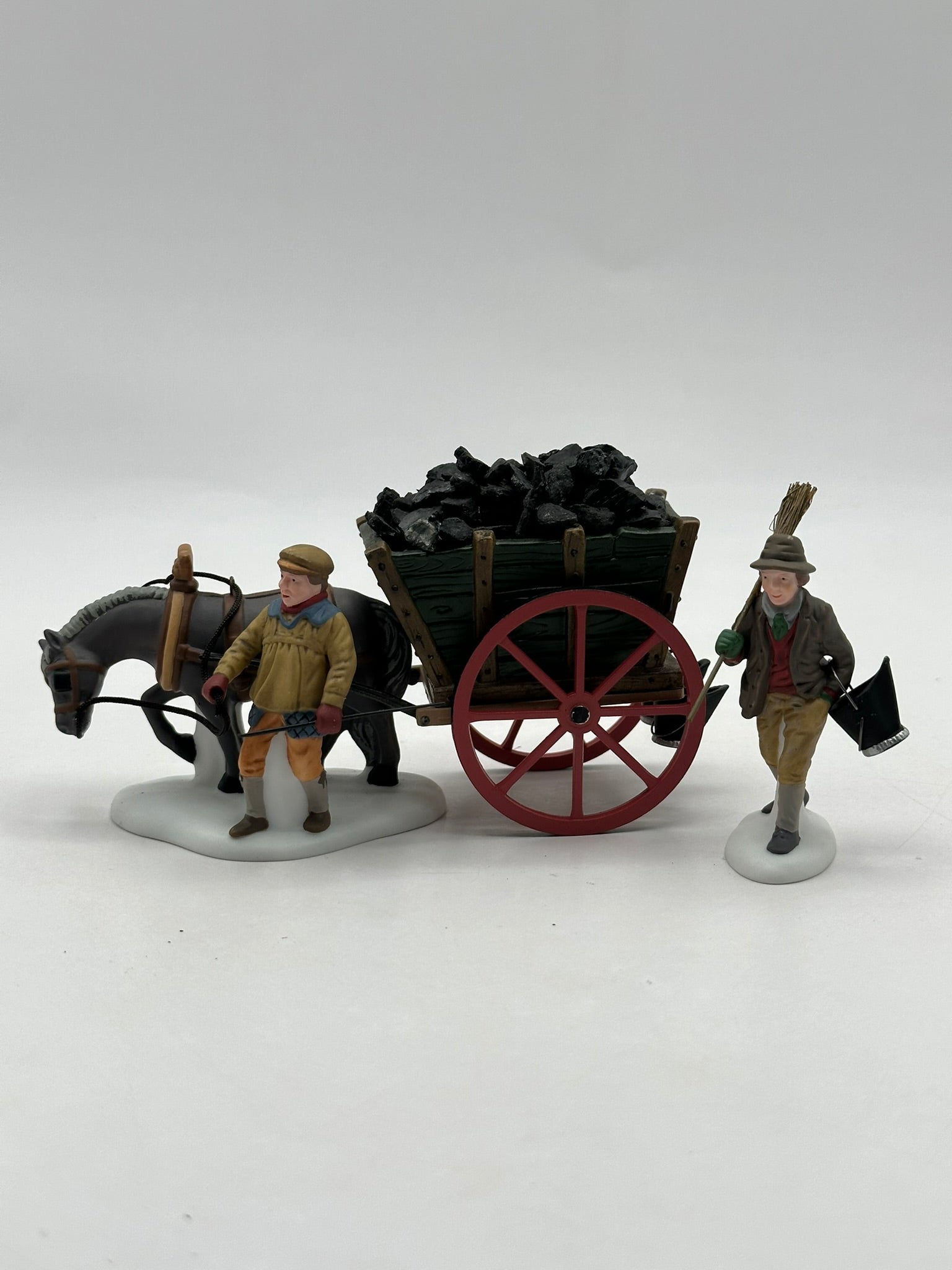 The Delivering Coal for the Hearth accessory captures a vital part of Victorian winter life, keeping homes warm during the coldest months. This detailed set features a horse-drawn cart piled high with coal and two hard-working figures: the driver guiding the horse and a coal deliveryman carrying a bucket and broom.