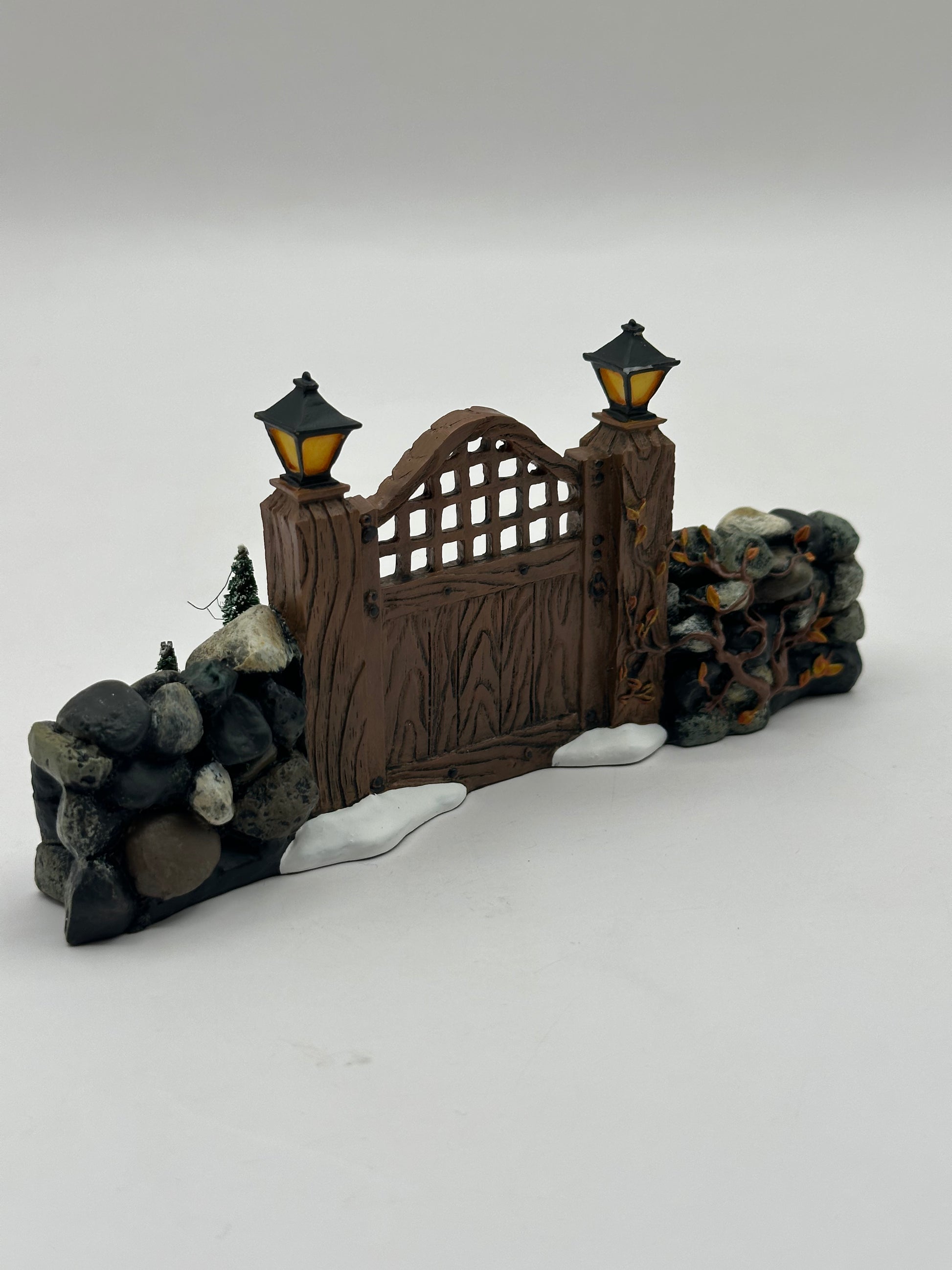 Fieldstone Entry Gate provides a stately welcome to any village scene. Sturdy stone wall with a classic wood gate, it marks the perfect entrance to a grand estate, park, or festive gathering place.
