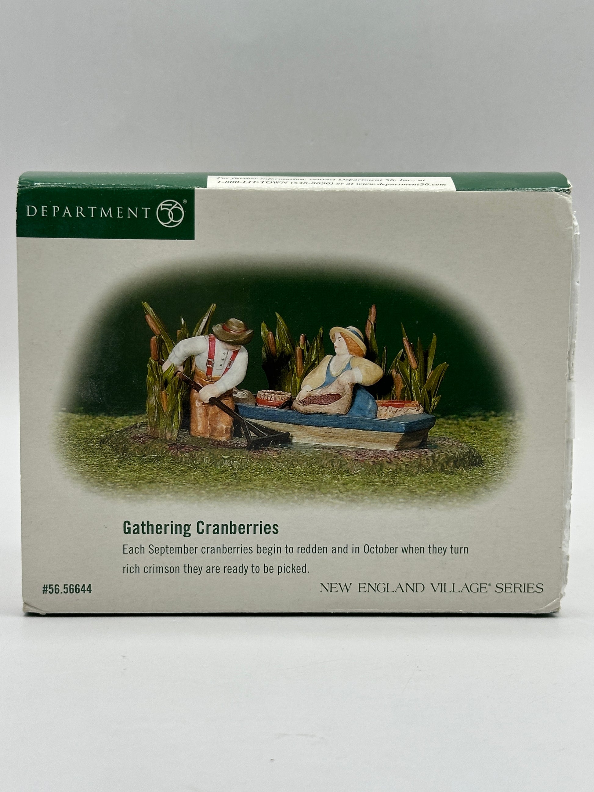 Gathering the Cranberries captures a classic autumn scene in your village display. Two people bend over a marshy bog, carefully collecting bright red cranberries in baskets, their clothing and hats suggesting a crisp, cool day.