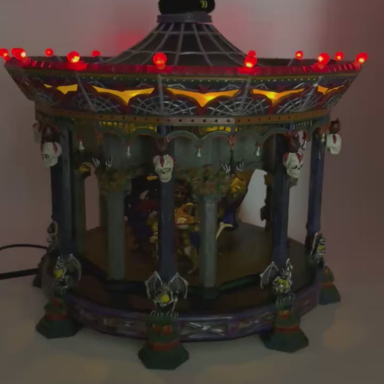 Round and round they go - spirits ride in style on the eerie Ghostly Carousel. This hauntingly detailed animated piece features ghostly figures mounted on skeletal horses, circling beneath a tattered canopy. With soft, spooky lighting and movement, it brings spectral fun and vintage carnival vibes to your Halloween village.