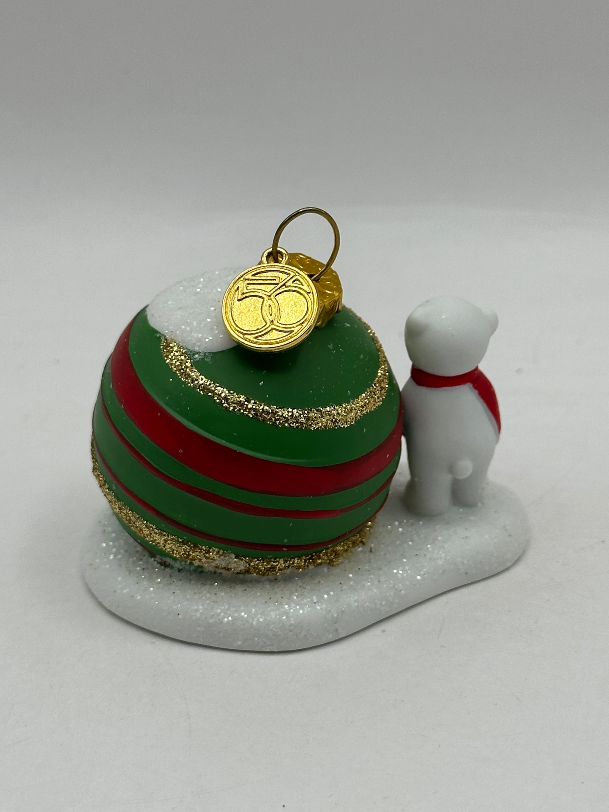 This Department 56 accessory features an adorable polar bear standing beside his glittering, ornament-shaped igloo, complete with a red scarf, a golden bow, and a dish of treats waiting by the door. With sparkling snow details and festive colors, this piece adds a heartwarming, wintry touch to any holiday tree or North Pole display.