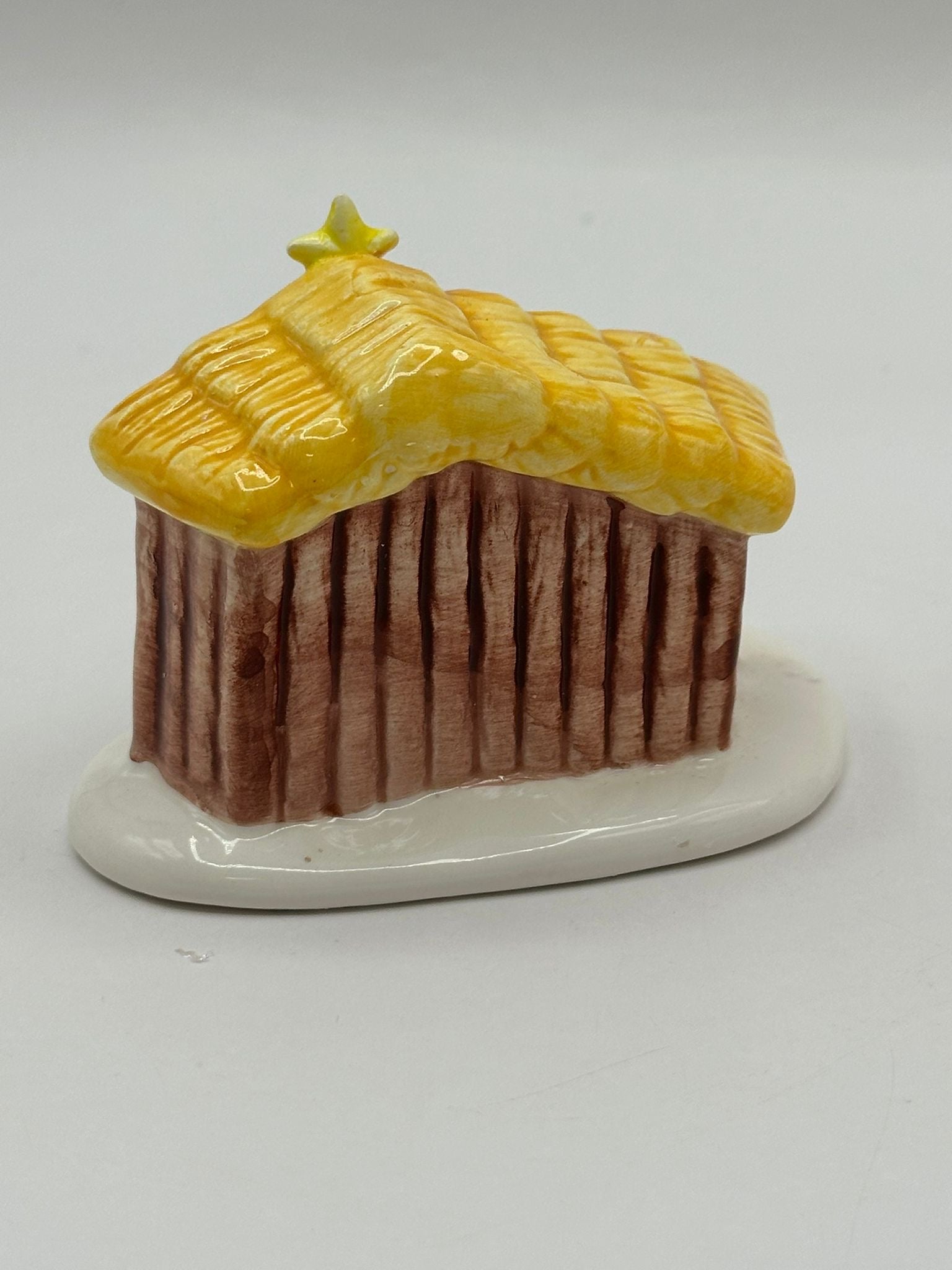 This nativity scene features a cozy, rustic stable with a softly curved roof and a star at the peak. Inside, Mary and Joseph kneel beside baby Jesus resting in a small manger, while a gentle animal companion looks on.