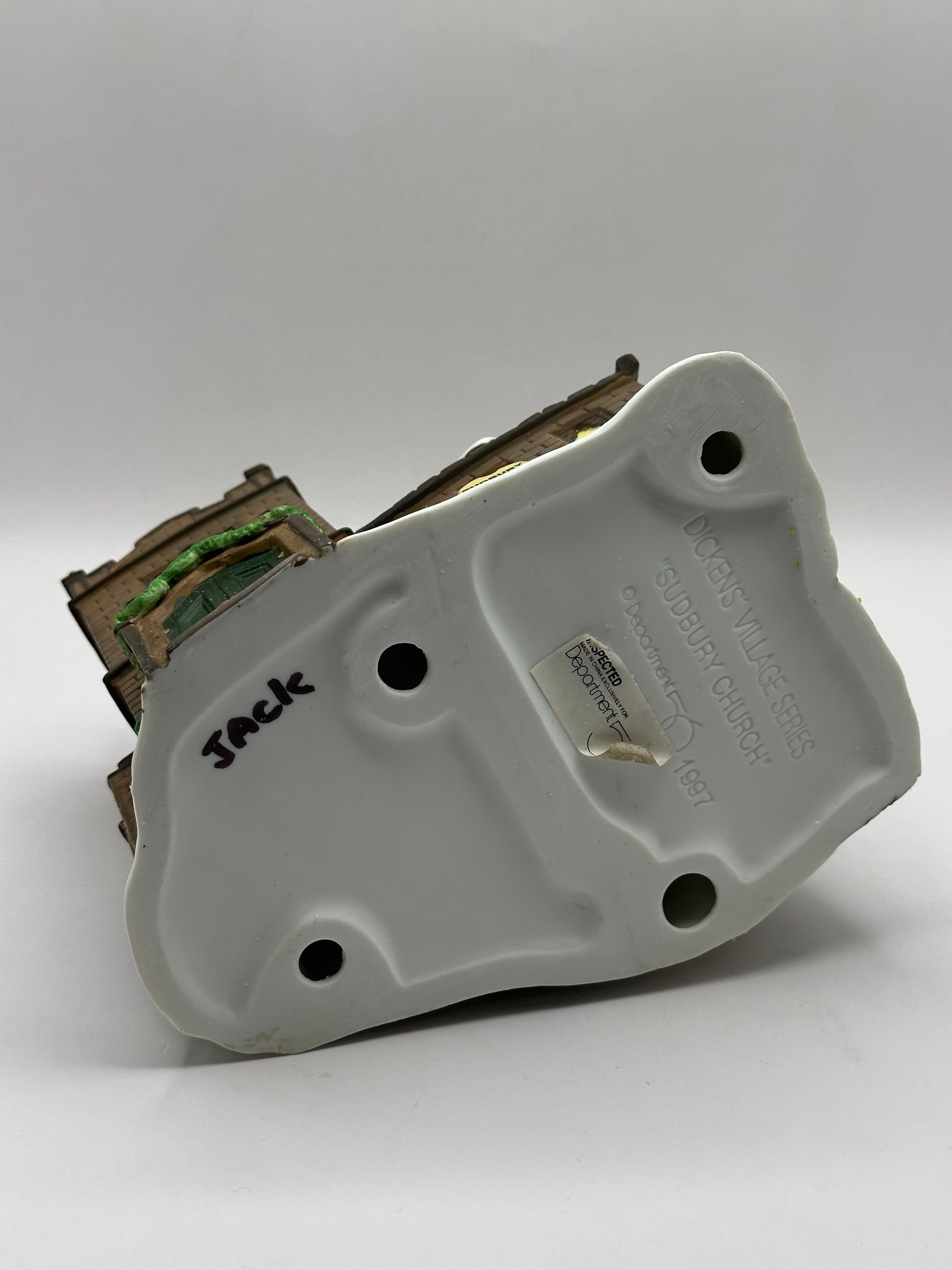 | Condition: Excellent vintage condition. Comes with original box. Includes light cord. Note: This piece was previously owned by "Jack", as written on the box and on the bottom of the church. Also note that the flag is missing. |