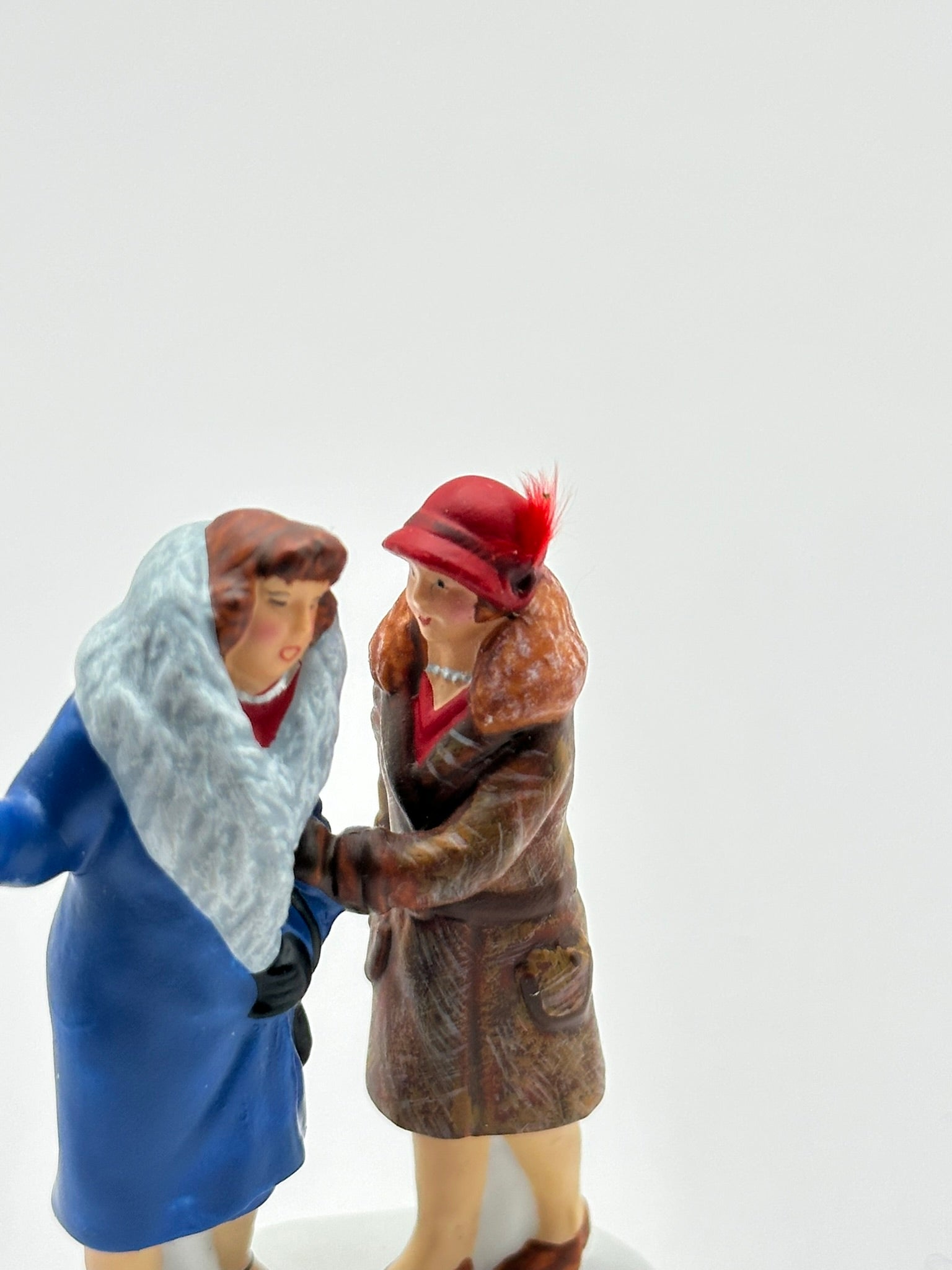 Two elegantly dressed ladies share a moment of conversation on a snowy sidewalk, one gesturing warmly as if inviting the other for an afternoon tea. Their vintage winter coats, fur trim, and stylish hats capture the sophistication of city life during the holiday season.