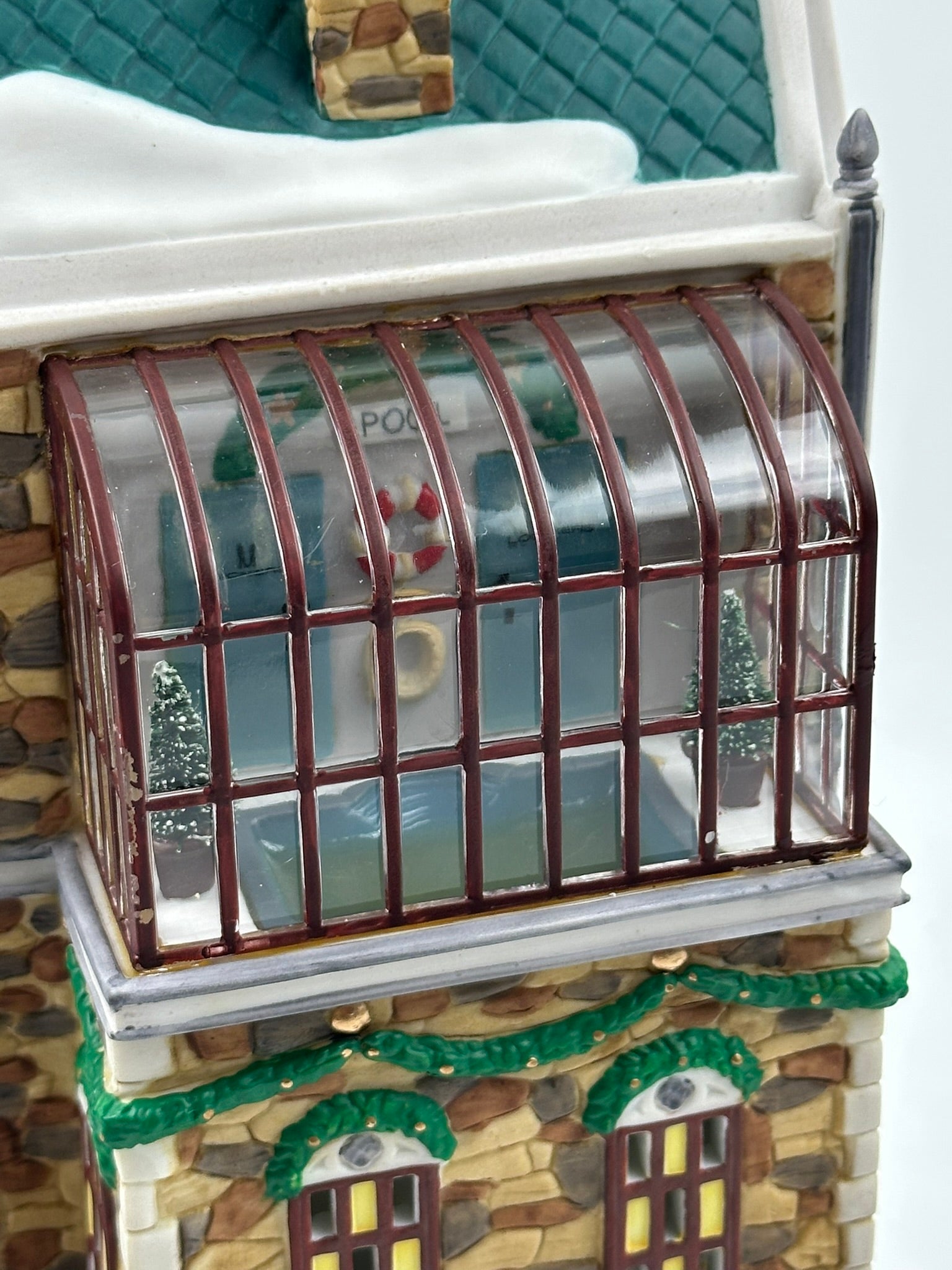 Add sophistication to your village with The University Club, a stately retreat for academics, athletes, and holiday socialites. Featuring a stone façade, festive wreaths, and a glass-enclosed rooftop lounge, this building blends tradition with upscale charm.
