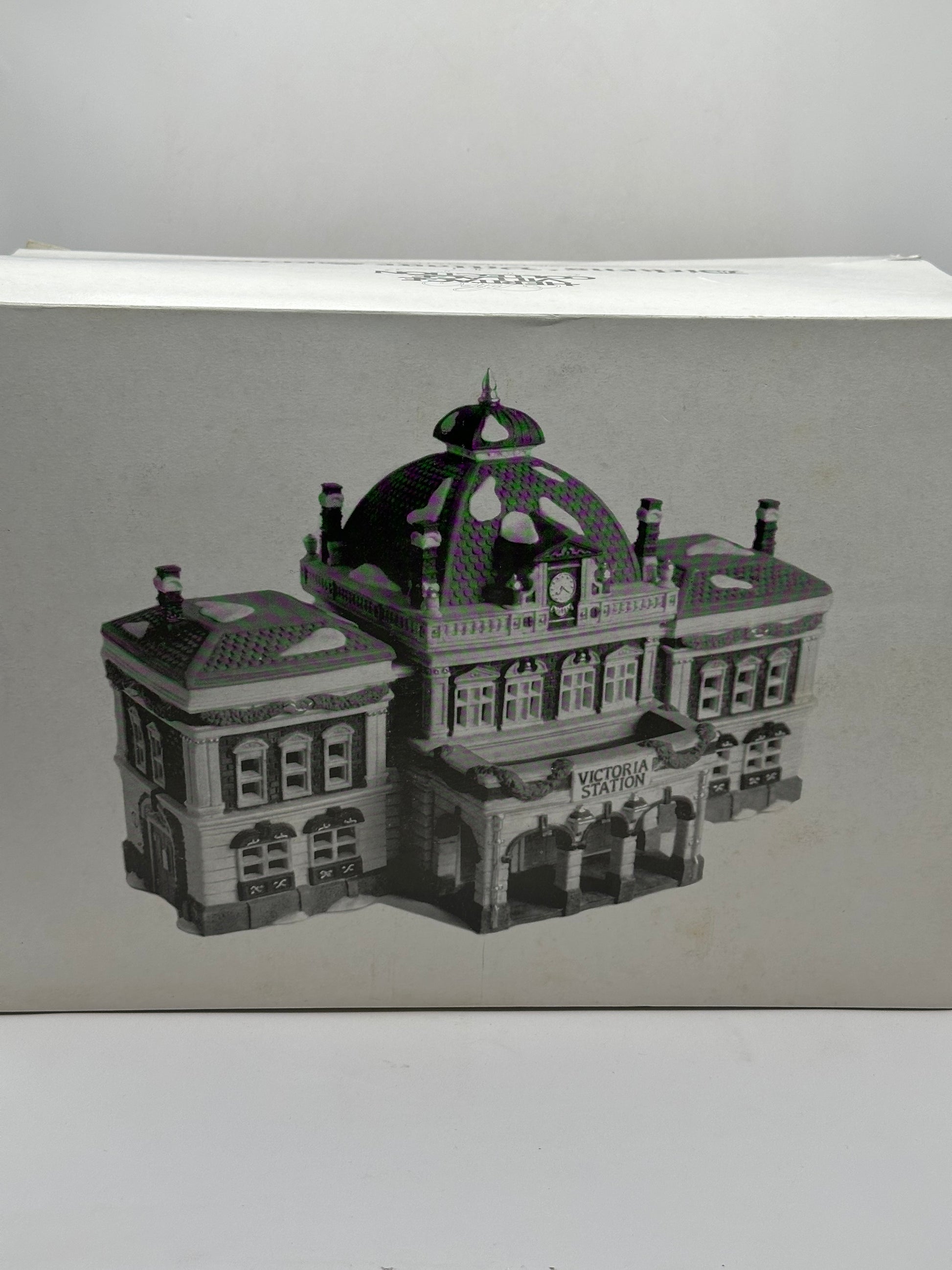 Step into the hustle and bustle of Victoria Station, a busy Victorian railway hub. Horse-drawn carriages arrive and depart, porters carry luggage for eager travellers, and village folk hurry to catch their trains. With its detailed architecture and lively scene, Victoria Station captures the excitement of 19th-century travel and is a charming focal point for your Dickens Village display.