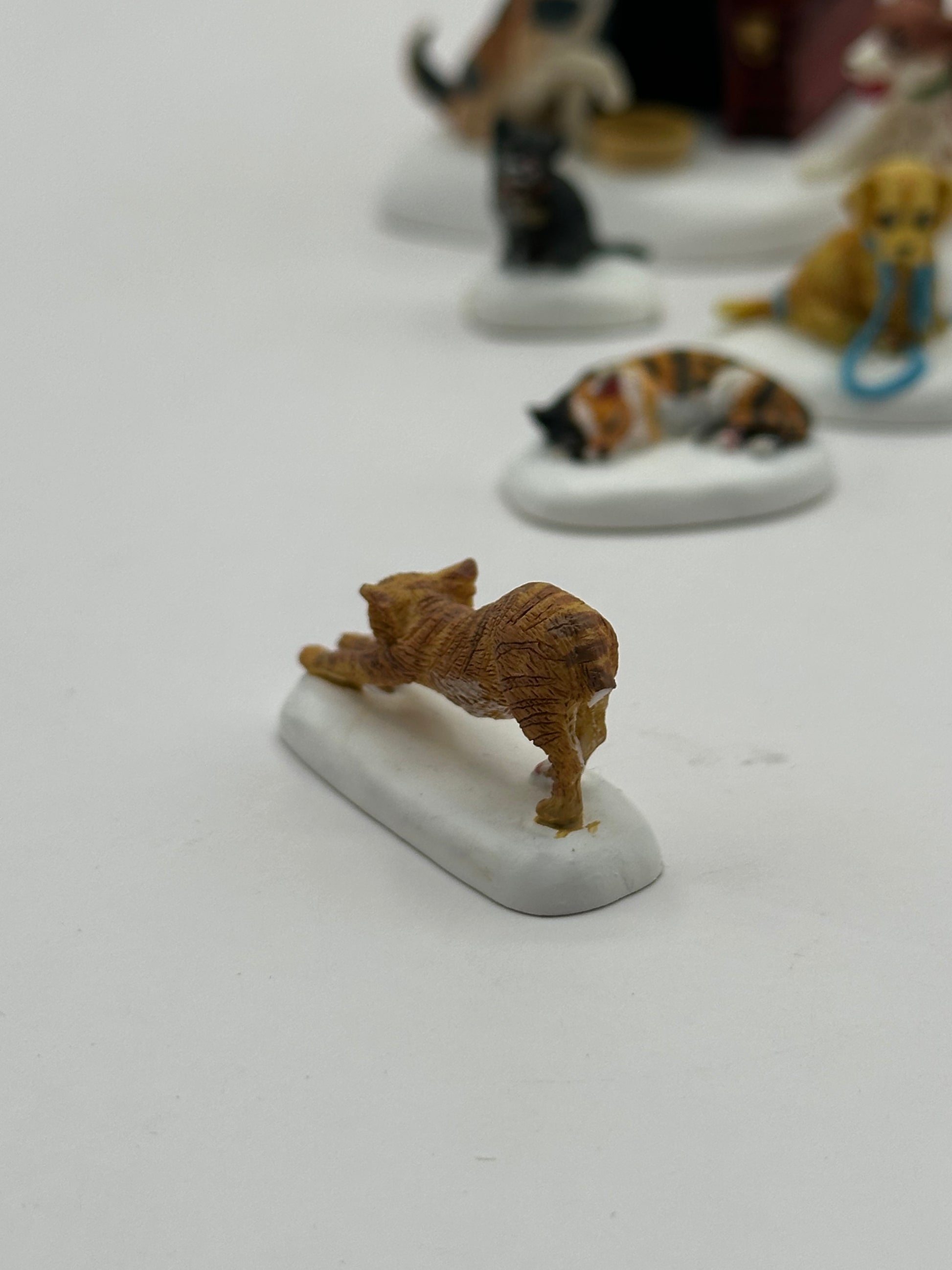 Village Cats and Dogs is a lively little gathering of pets that brings instant charm to your display. A classic red doghouse sets the scene, surrounded by a playful mix of cats and dogs: a curious pup tugging on a blue leash, a friendly collie mid-stride, and a patched dog keeping watch by the door. Nearby, a pair of cats lounge and stretch contentedly, while a tiny black kitten adds a touch of mischief.