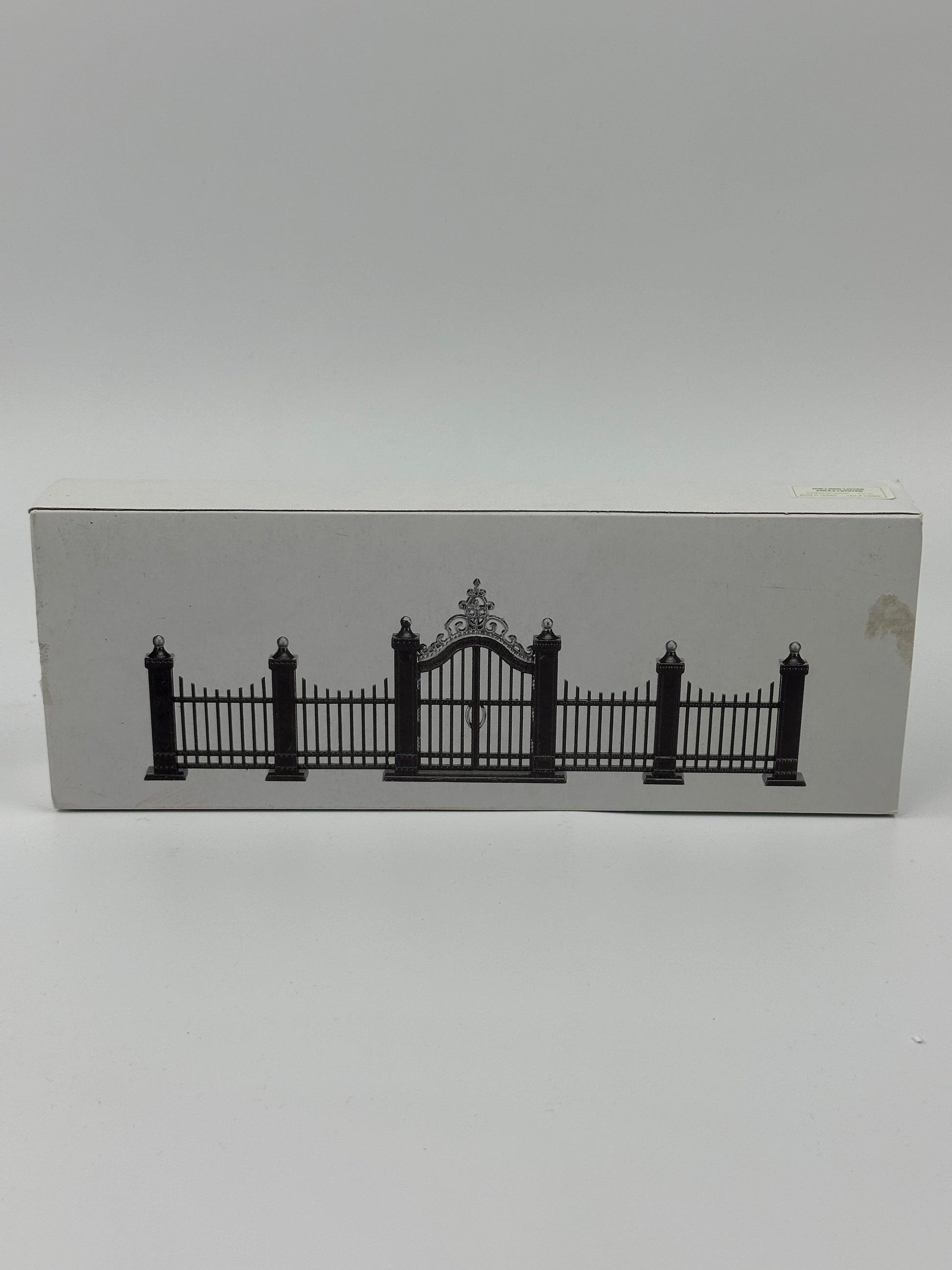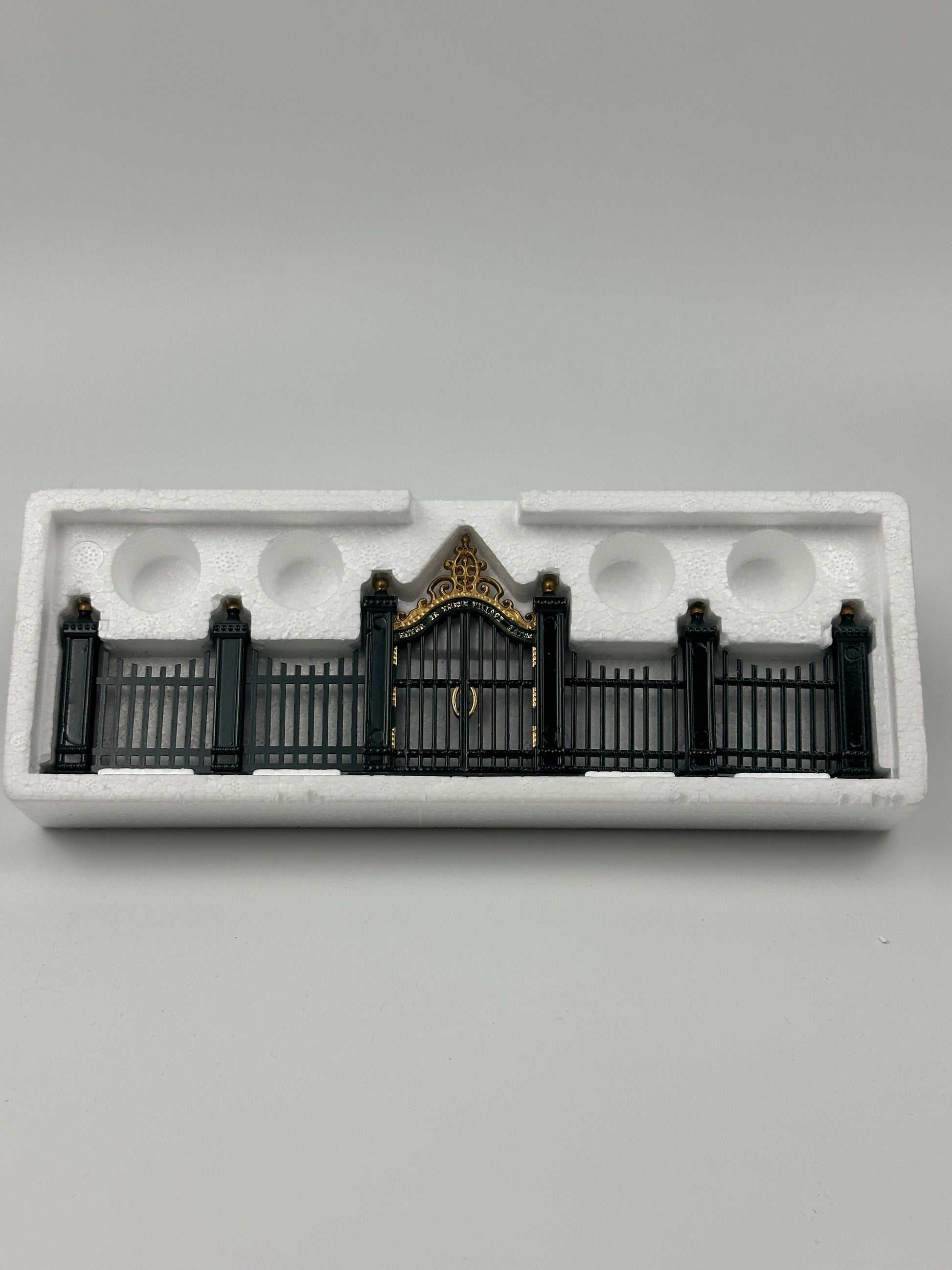 Bring a touch of grandeur to your village display with the Department 56 - Village Wrought Iron Gate and Fence (9 Piece Set). Finished in deep green with gold accents, this finely crafted set features a central gate crowned with ornate scrollwork and the inscription “Enter Ye These Villages Gates.” Whether used to frame a grand estate, enclose a festive square, or line the edge of a snowy path, these elegant pieces add structure and sophistication to any Department 56 village scene.