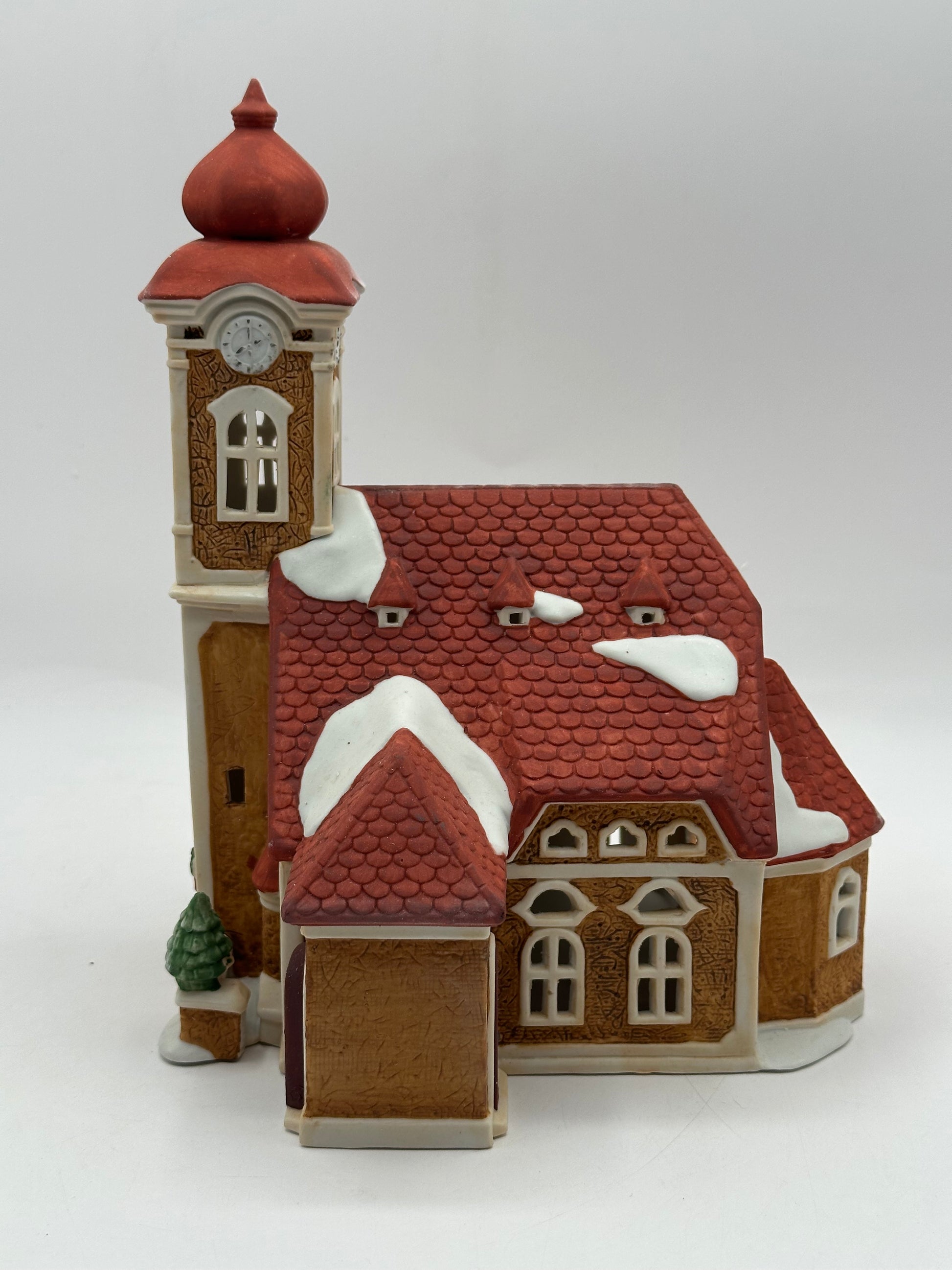 A beautiful focal point for your holiday village, the Alpine Church features a tall clock tower, red-tiled roof, and elegant arched windows. Accented with festive greenery and snow-covered details, this timeless piece brings a sense of peace and tradition to your Alpine Village display.