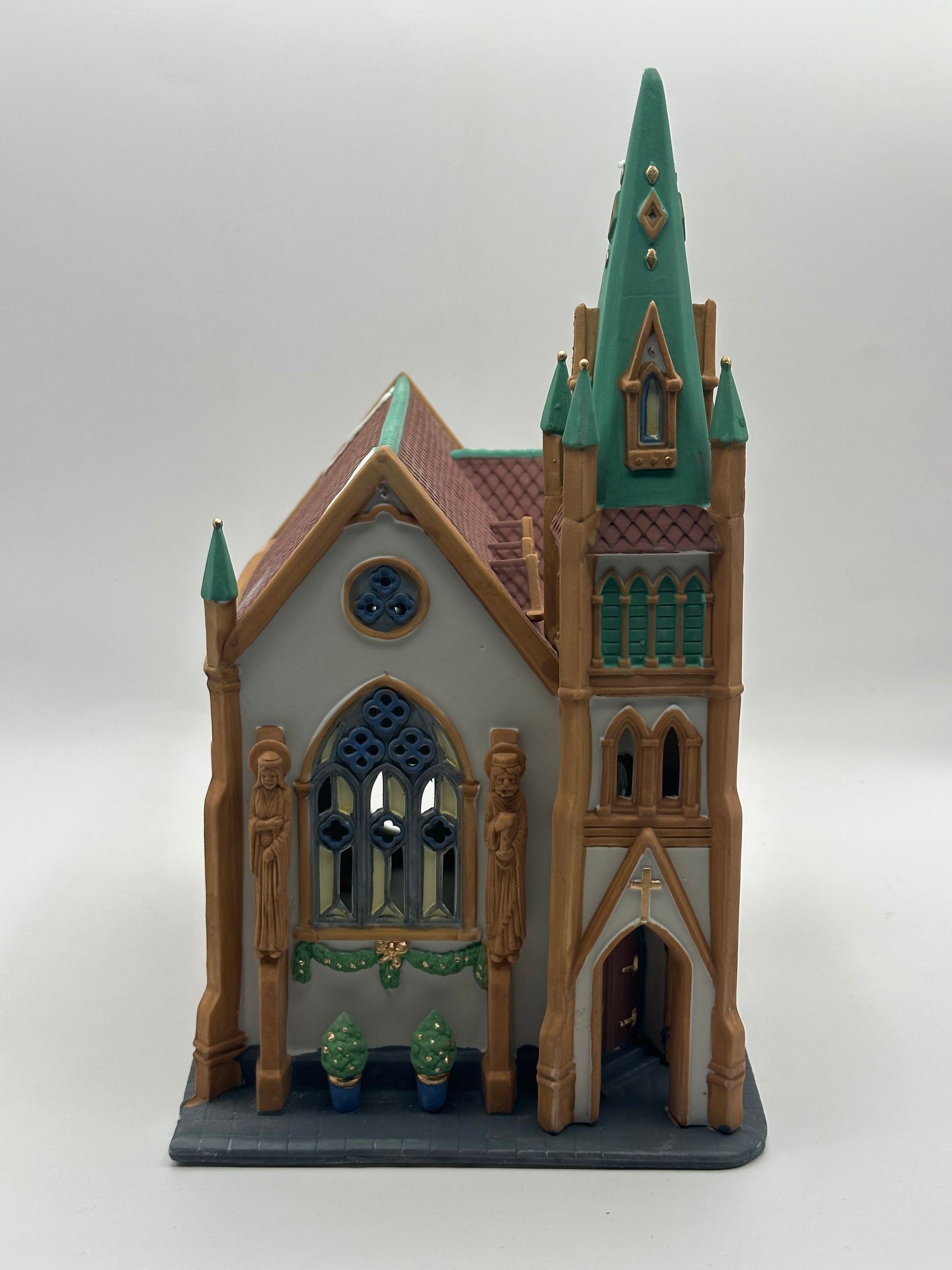 A beautifully detailed Gothic-style church with soaring spires, stained glass windows, and festive greenery, an inspiring and timeless centerpiece for your Christmas in the City village!