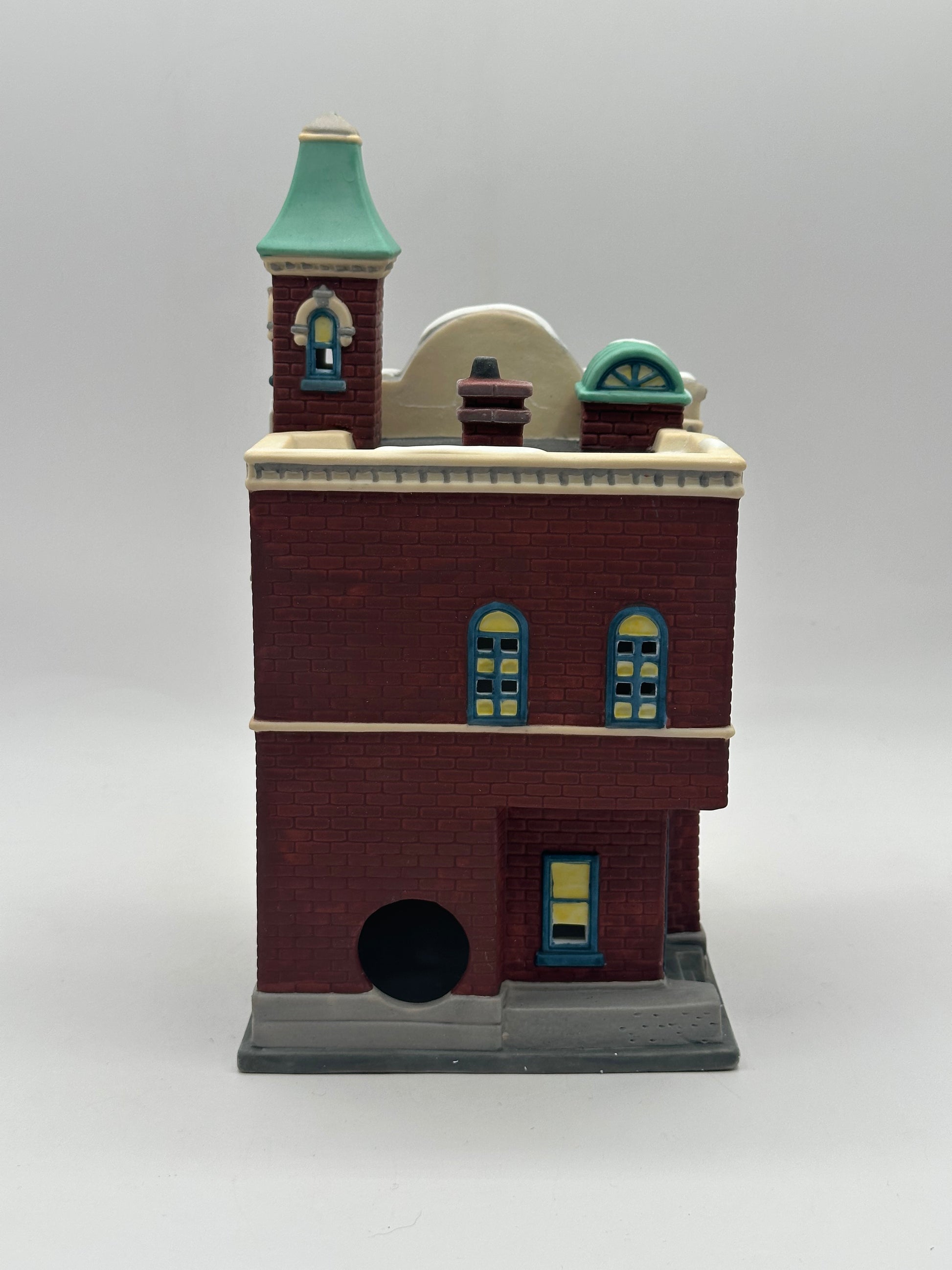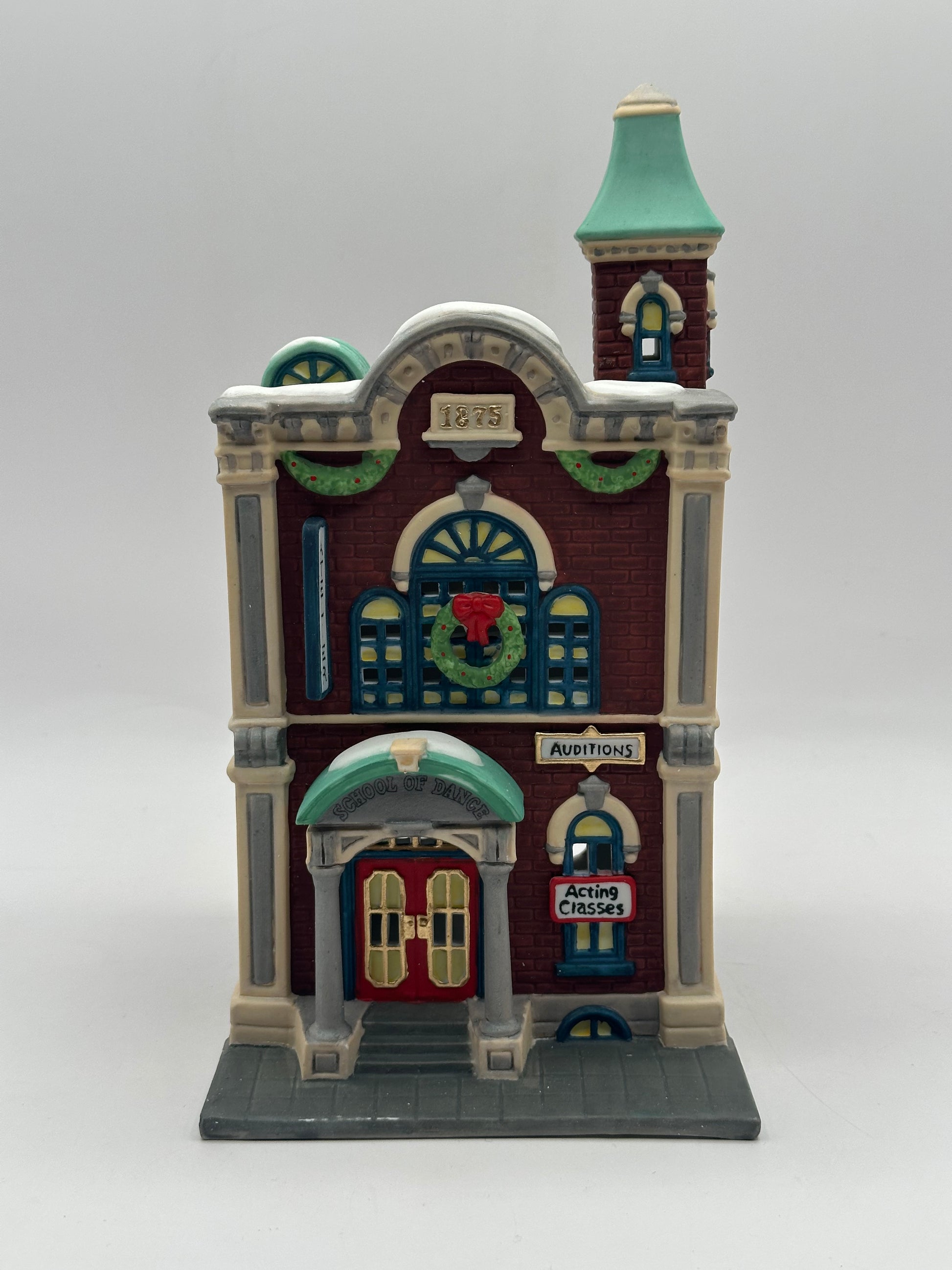 A charming brick Arts Academy featuring festive wreaths, arched windows, and classic holiday detailing. Perfect for adding creative flair to your Christmas in the City village display!