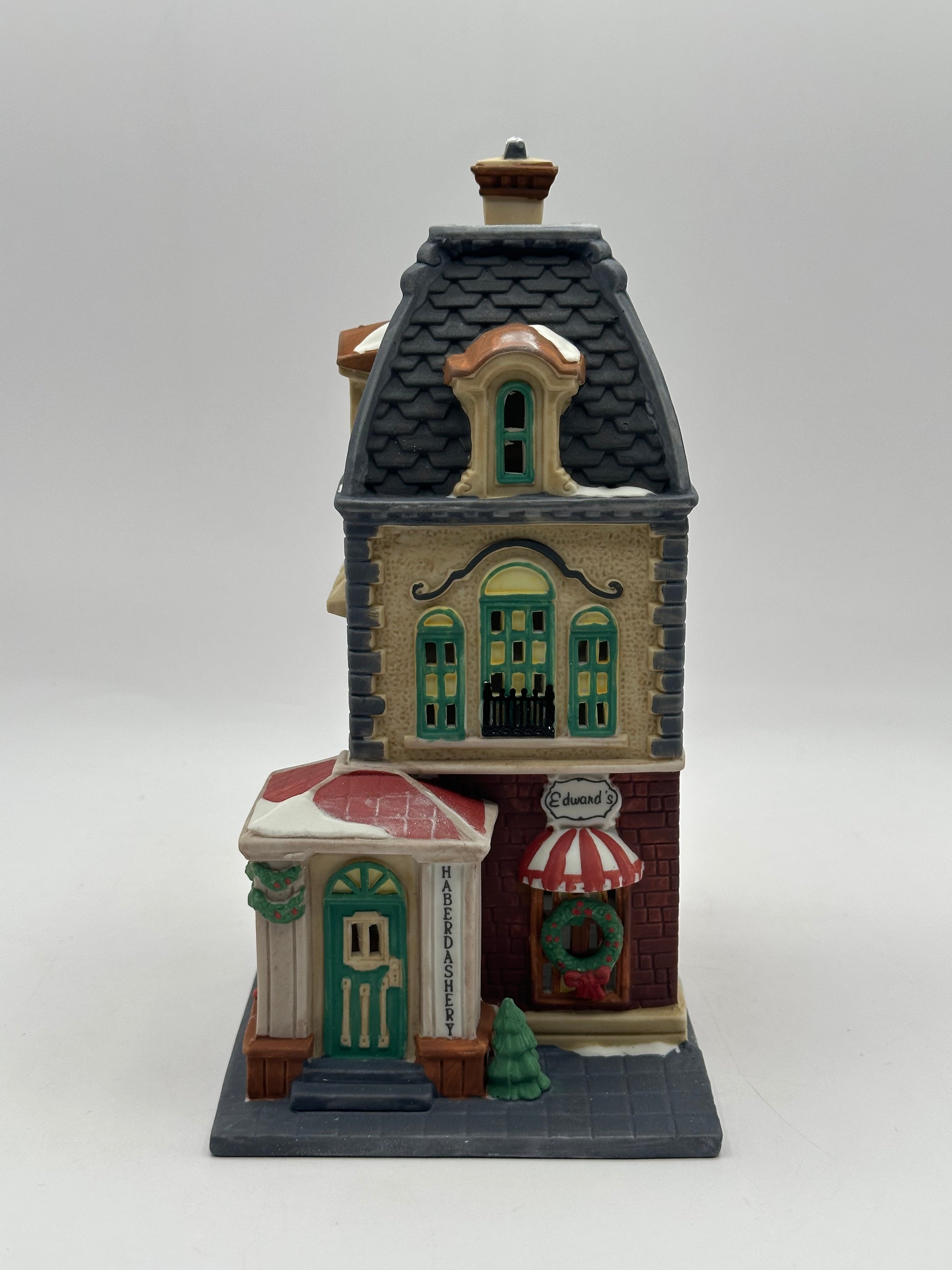 Bring classic charm to your village with the Haberdashery, part of the Christmas in the City series. This stylish piece features elegant brickwork, arched windows, and a striped awning over the shop entrance, complete with a festive wreath. Perfect for adding vintage flair and a touch of high fashion to your urban holiday scene!