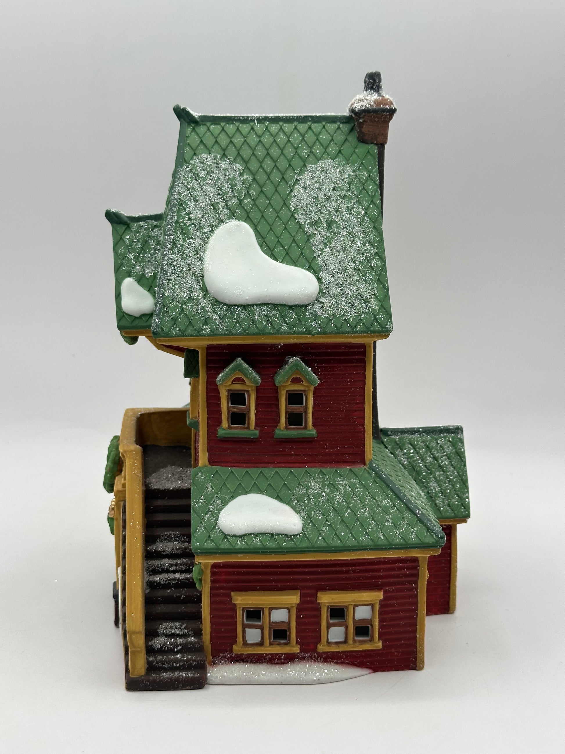 Tucked among snowy pines, Santa’s Rooming House offers a cozy retreat for North Pole visitors. With festive wreaths, warm lights, and whimsical architecture, this ceramic collectible brings a touch of holiday cheer to any Christmas village display.